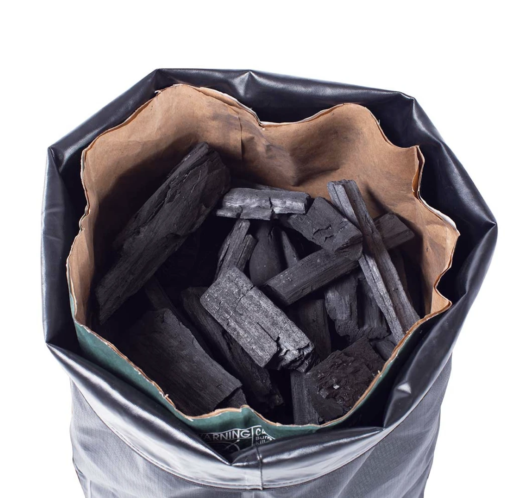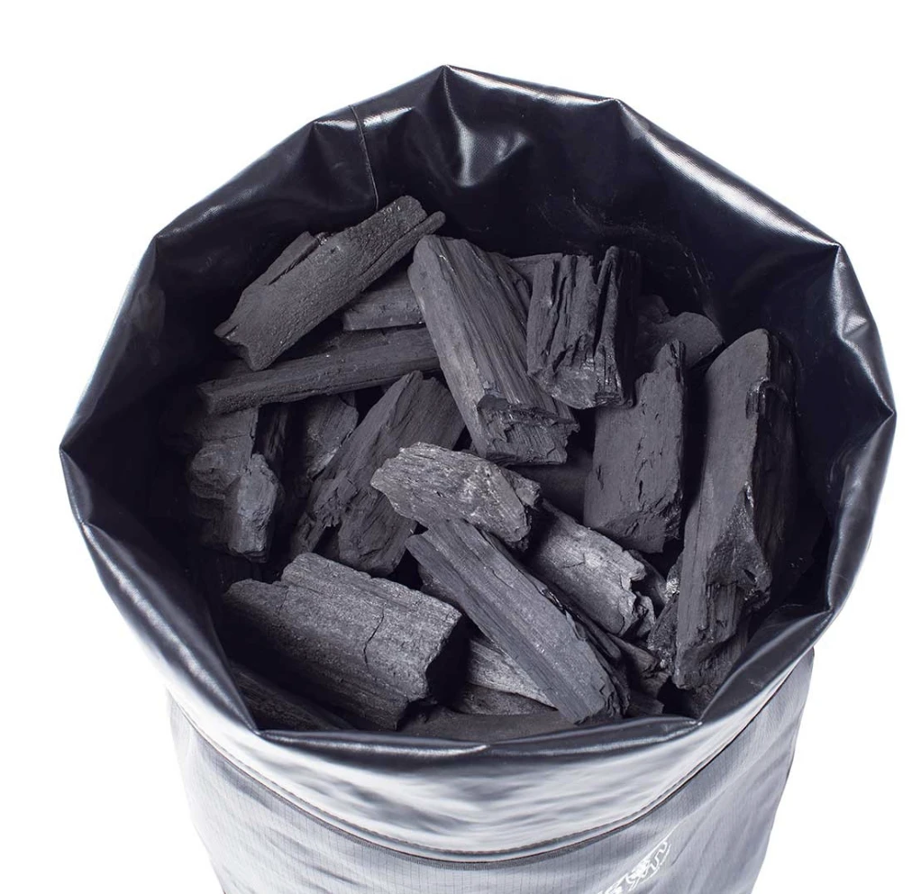De opbergtas voor het houtskool is gemaakt van dikke, duurzame polyester.