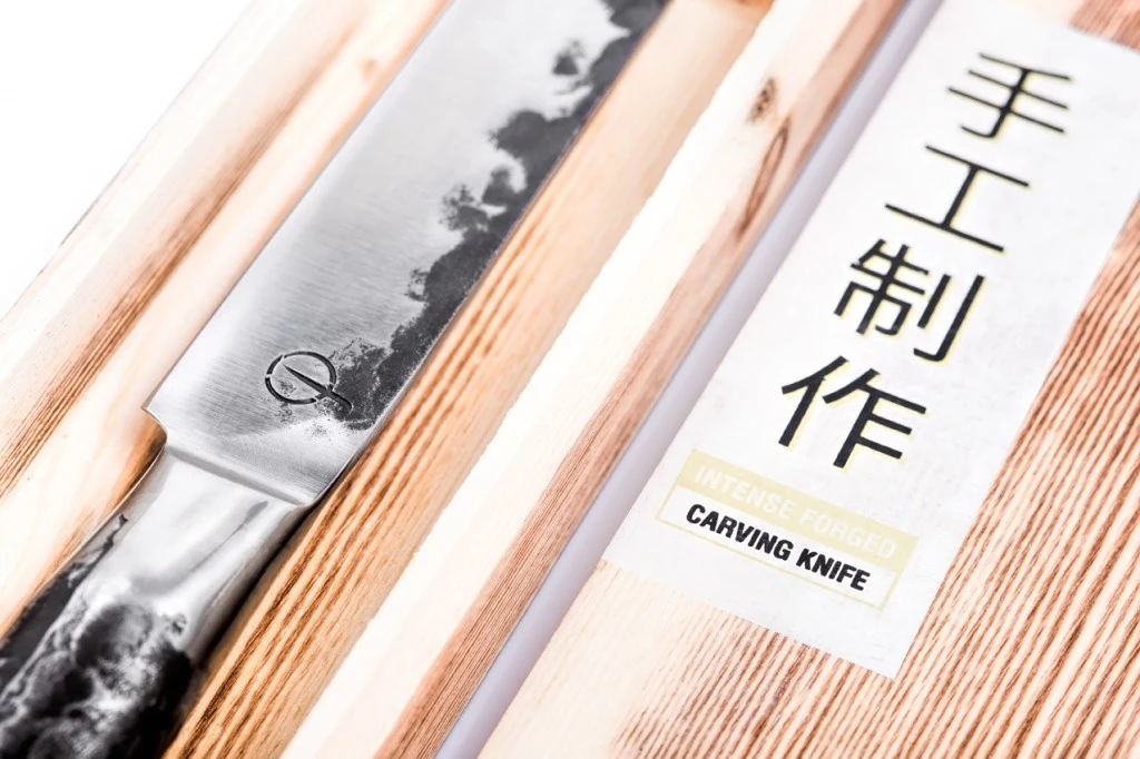 Het handvat is gemaakt van omgebogen roestvrij staal. Ondanks de grove afwerking en het ruige uiterlijk is het mes vlijmscherp en ligt het voortreffelijk in de hand.
