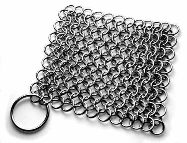 The Bastard Cast Iron Scrubber is gemaakt van roestvrij staal en bestaat uit geschakelde ringen. Hij is vaatwasmachinebestendig